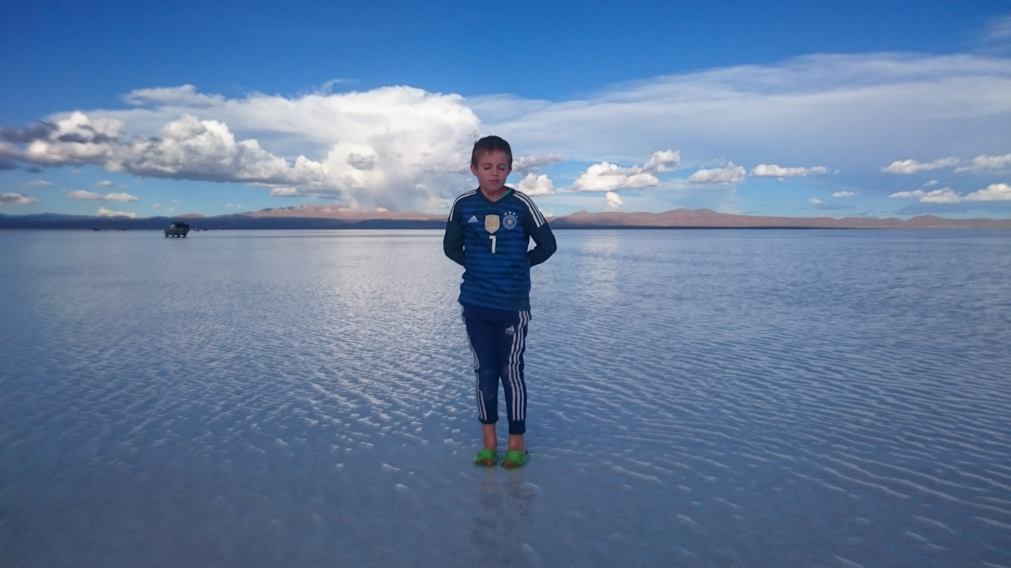 Dann suchten wir mit unserem Jeep das Weite. Der zweite Teil unserer Reisegruppe bestand aus vier höhenkranken Argentiniern, von denen der eine Geburtstag hatte und mit Luka auf den Schultern durch den Salzmatsch tanzte. Durch den einsetzenden Regen wurde der Boden des Sees zu einem gigantischen Reflektor, in dem sich die Wolken spiegelten. Himmel und Erde wurden eins. Nach einem phänomenalen Sonnenuntergang kehrten wir abends in ein schickes Hotel am Rande des Sees ein, komplett aus Salz erbaut, mit knackenden Kaminfeuern und einem Panoramablick auf einen Sternenhimmel, der uns schier die Sinne raubte.